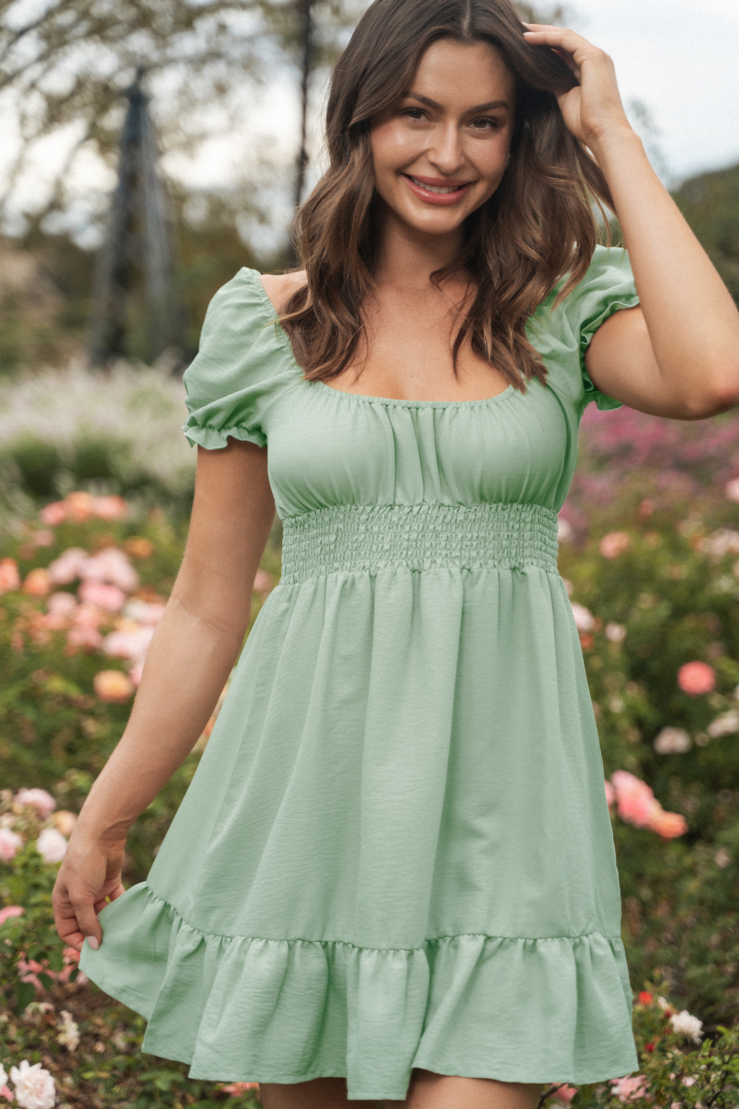 Soft Green Square Neck Puff Sleeve Flounce Mini Dress