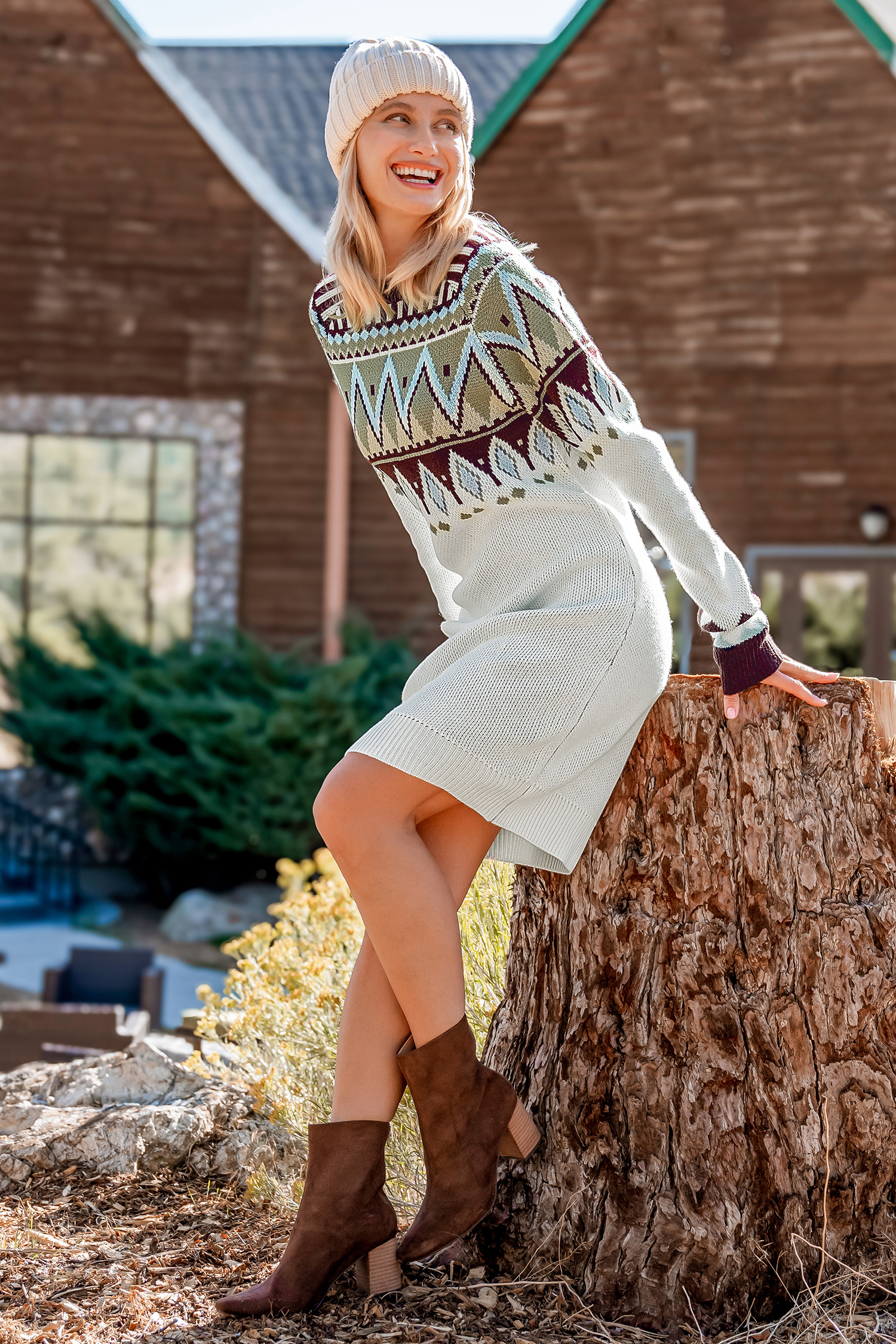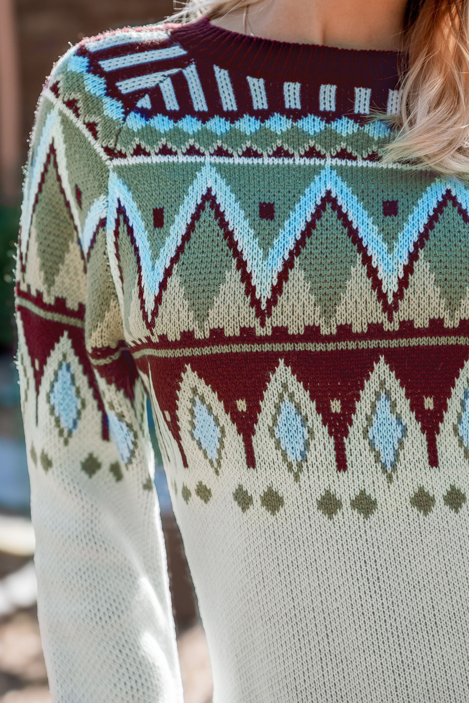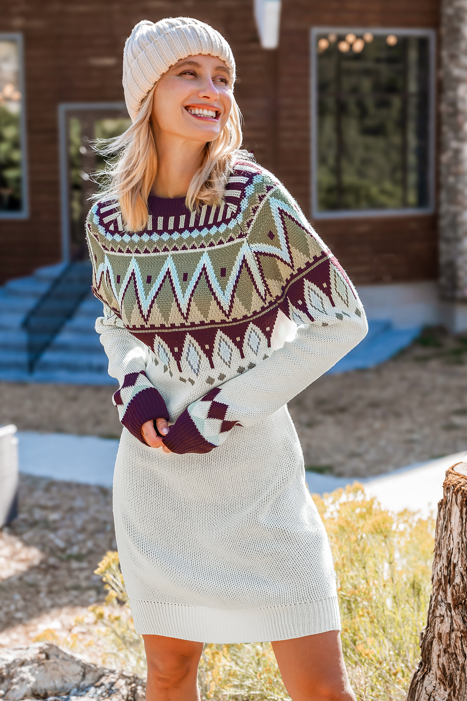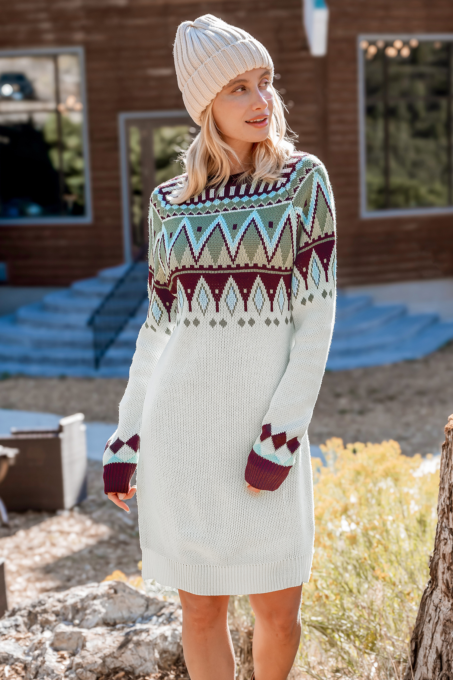 Southwestern Round Neck Long Sleeve Mini Sweater Dress