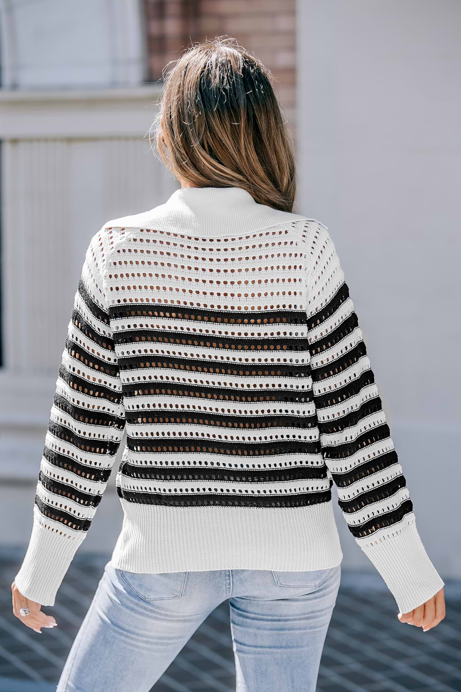 HomeStriped Collared V-Neck Perforated Knit Sweater