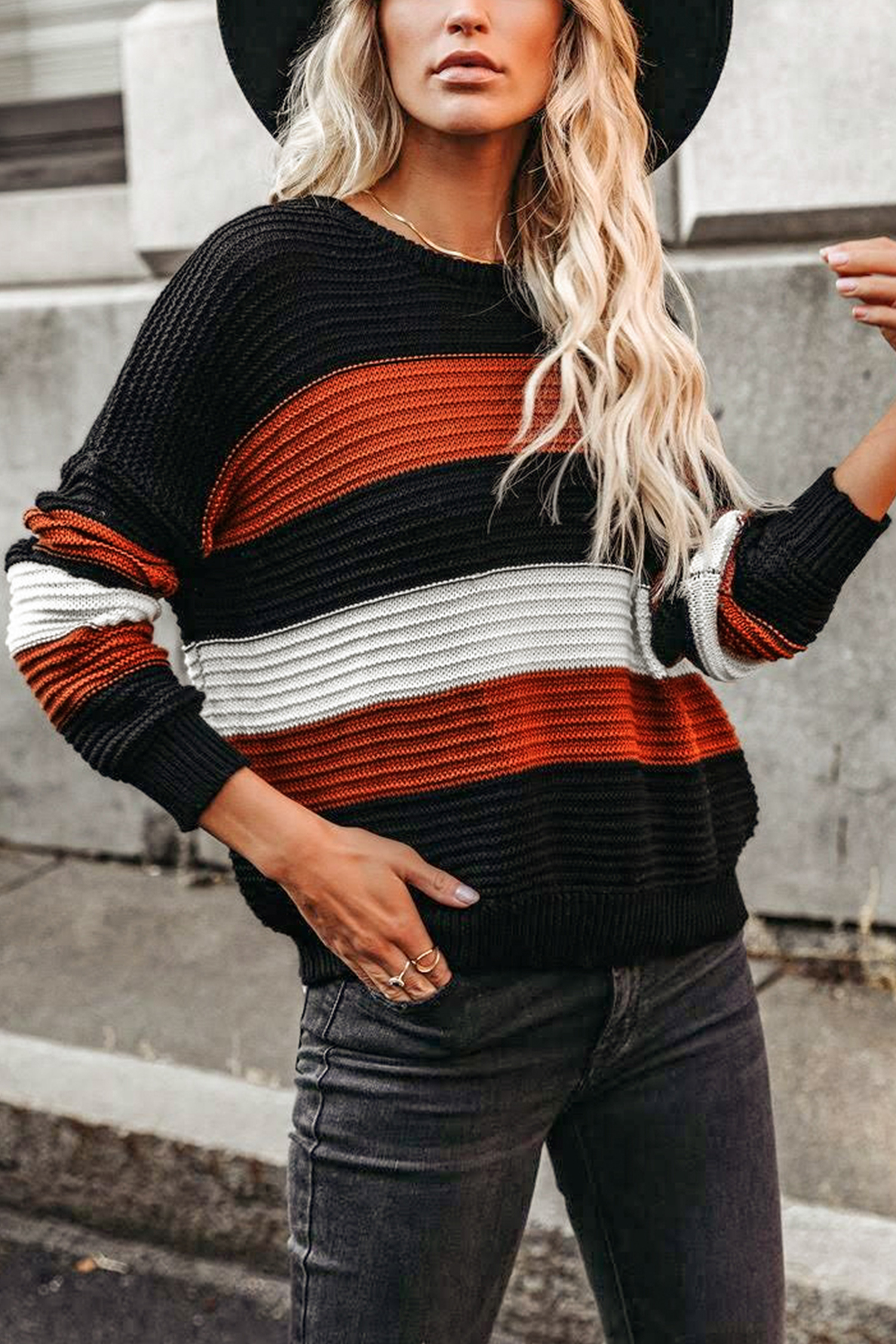 • Striped Long Sleeve Round Neck Sweater
