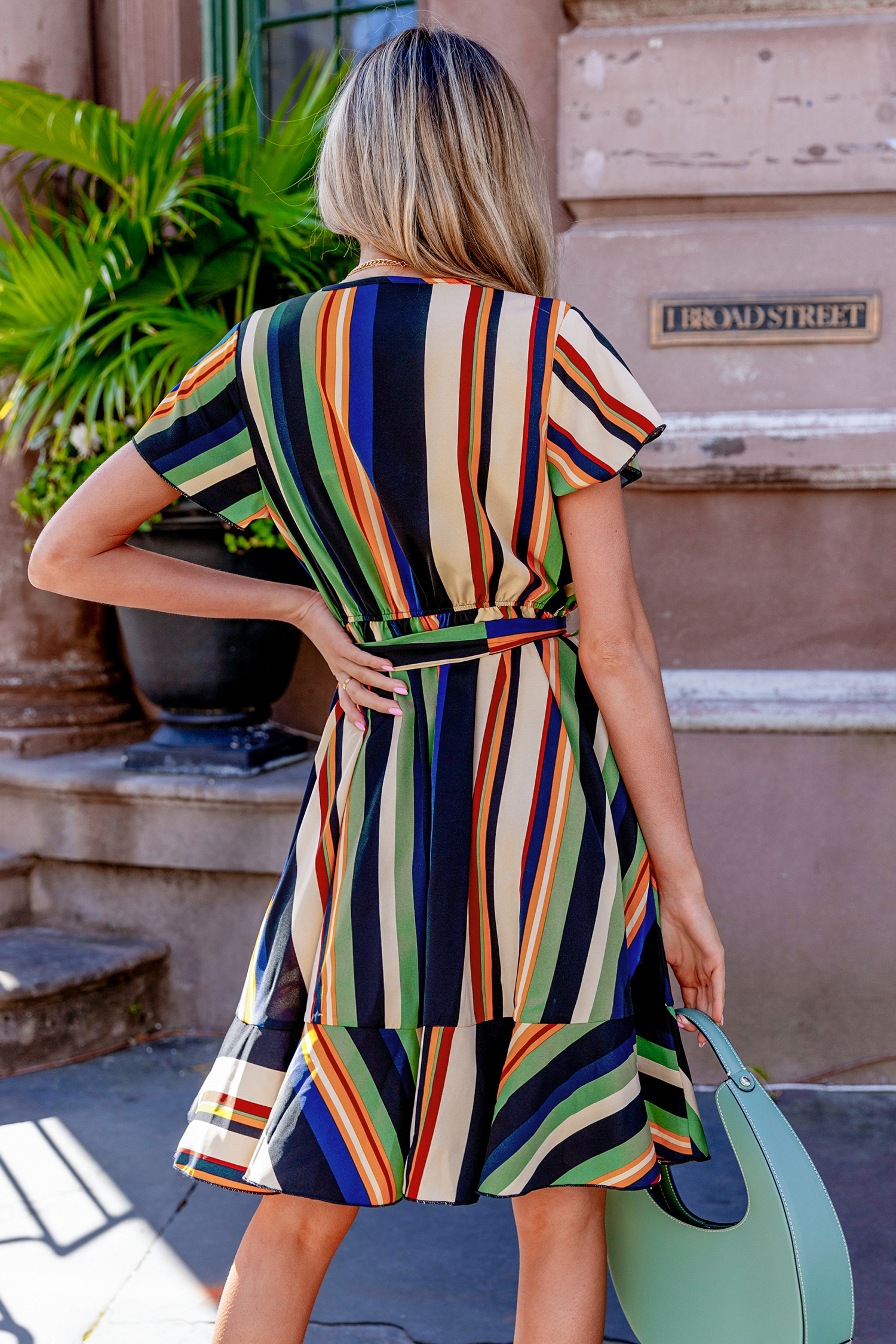 • Striped Surplice Flared Sleeve Midi Dress