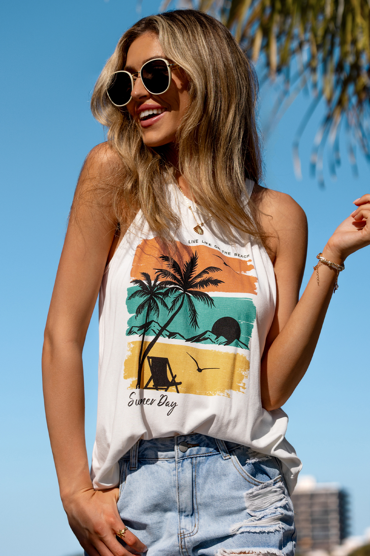 The Summer Day Graphic Tank Top brings playful energy to any outfit! A round neckline, sleeveless cut, and beachy graphic print come together for a casual, easy-to-wear piece that’s perfect for sunny days.