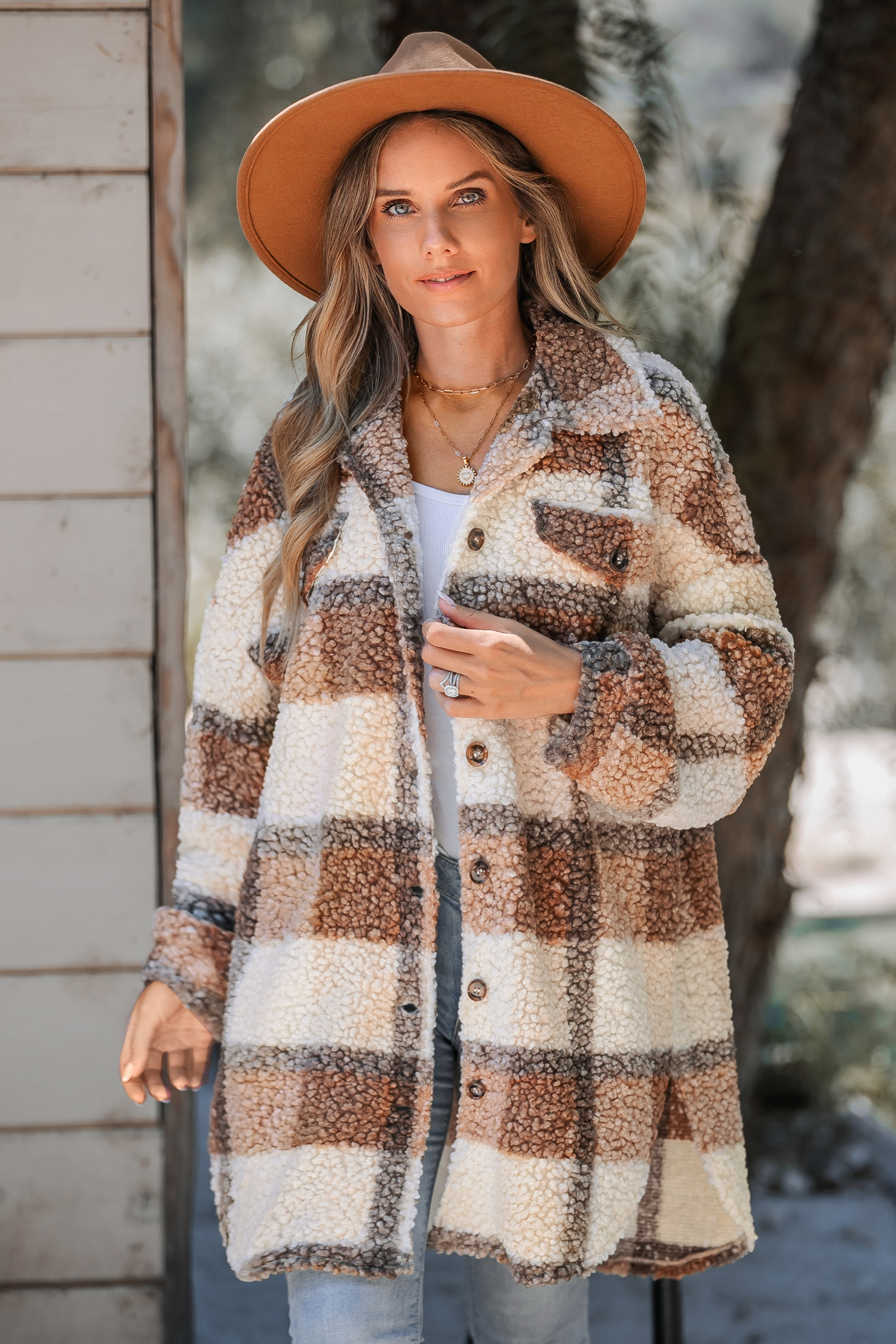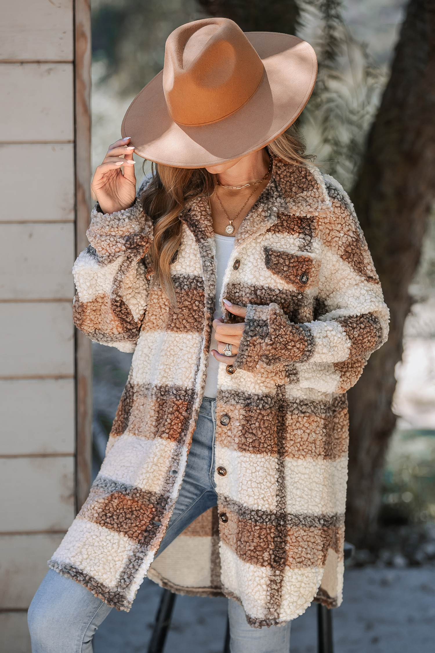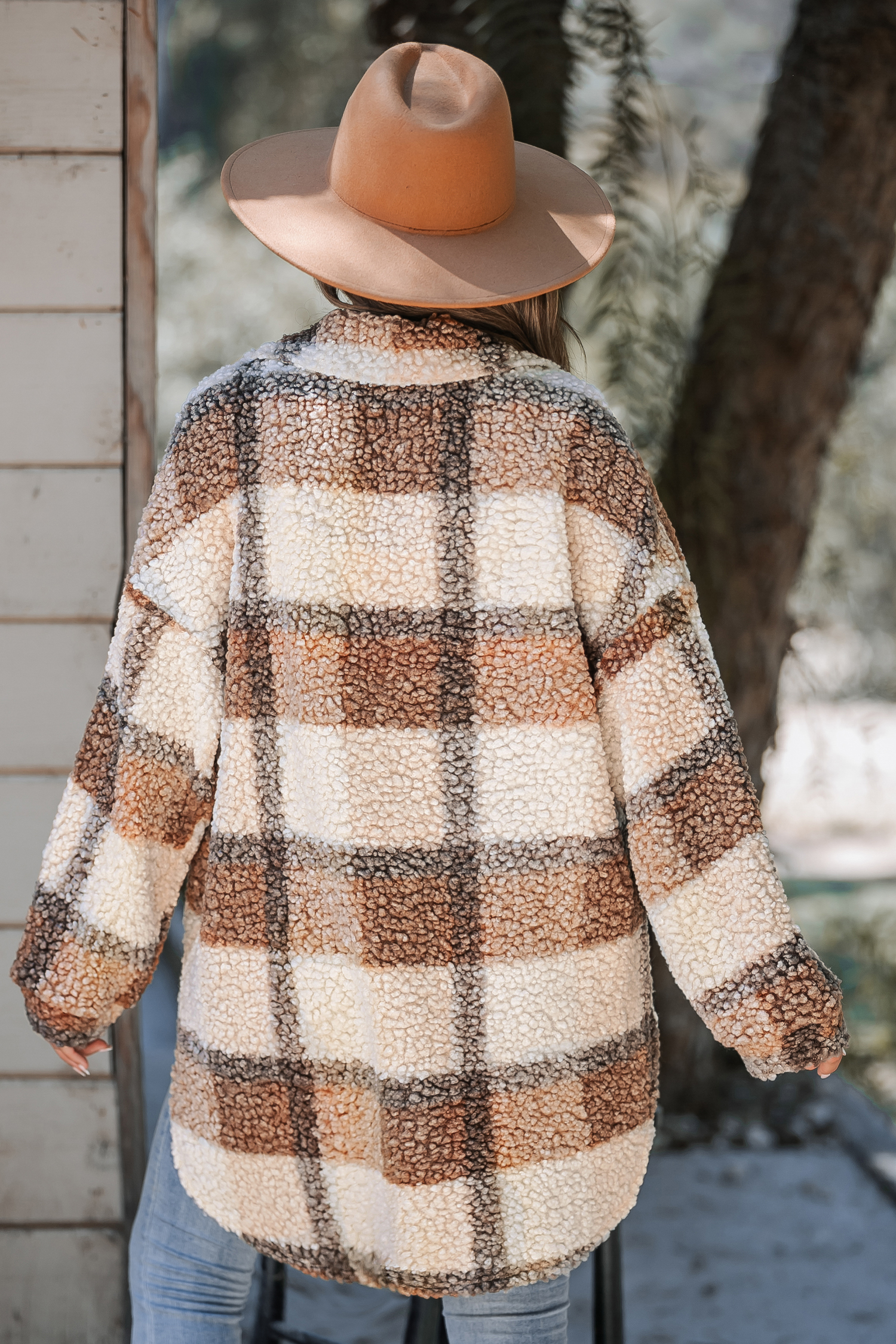 Tan Plaid Sherpa Button-Up Trench Coat