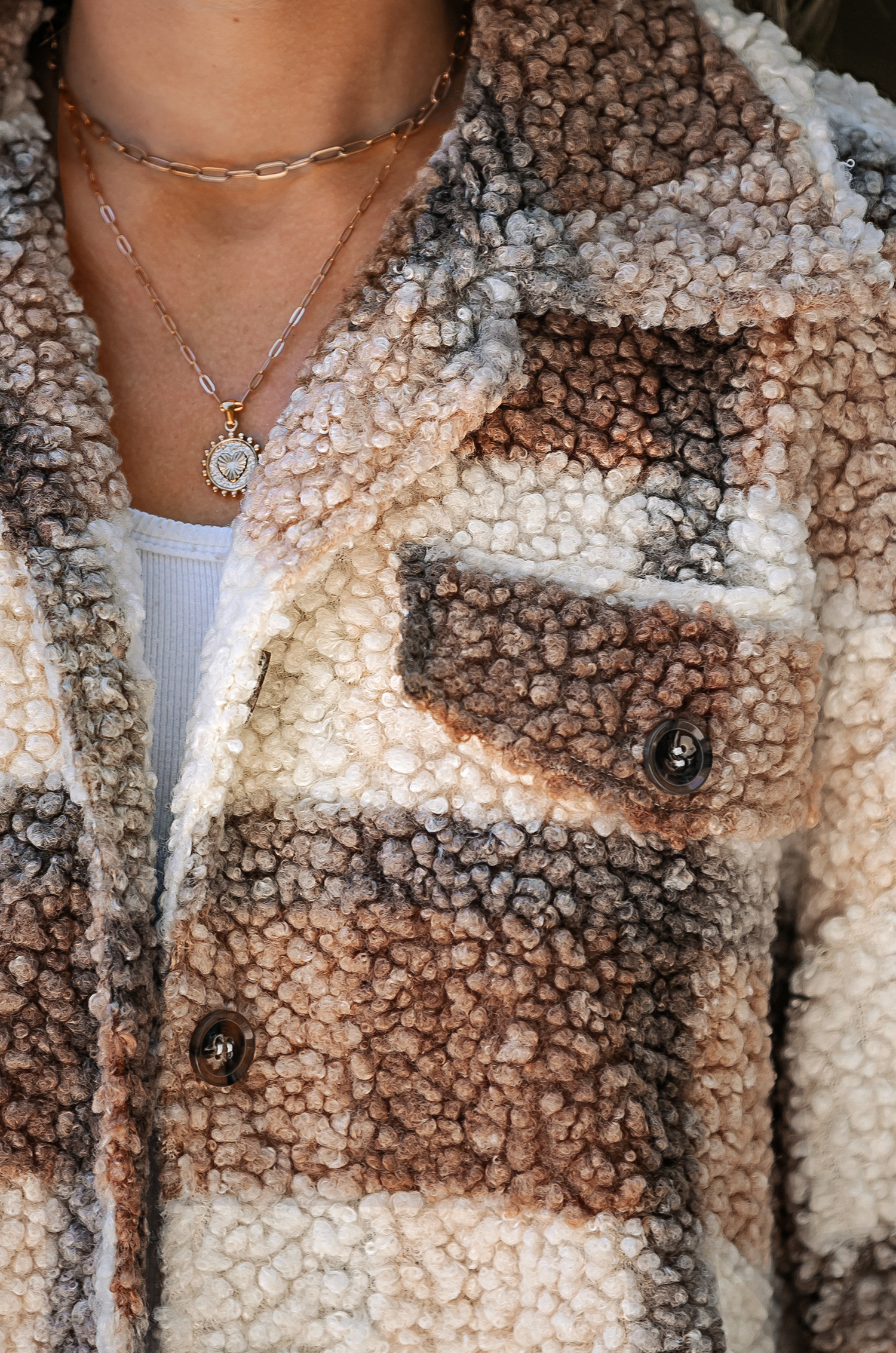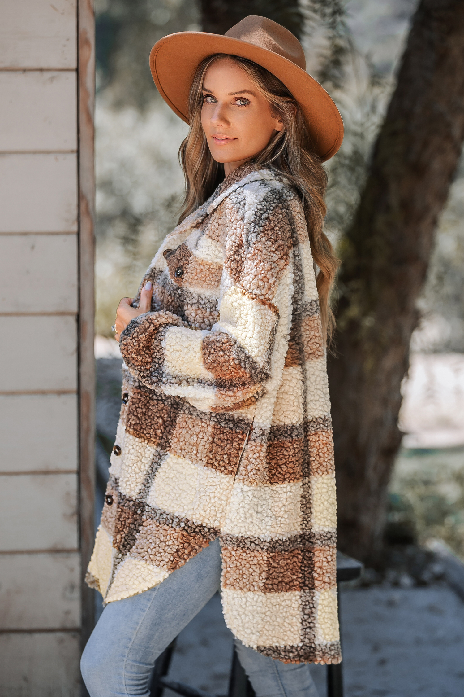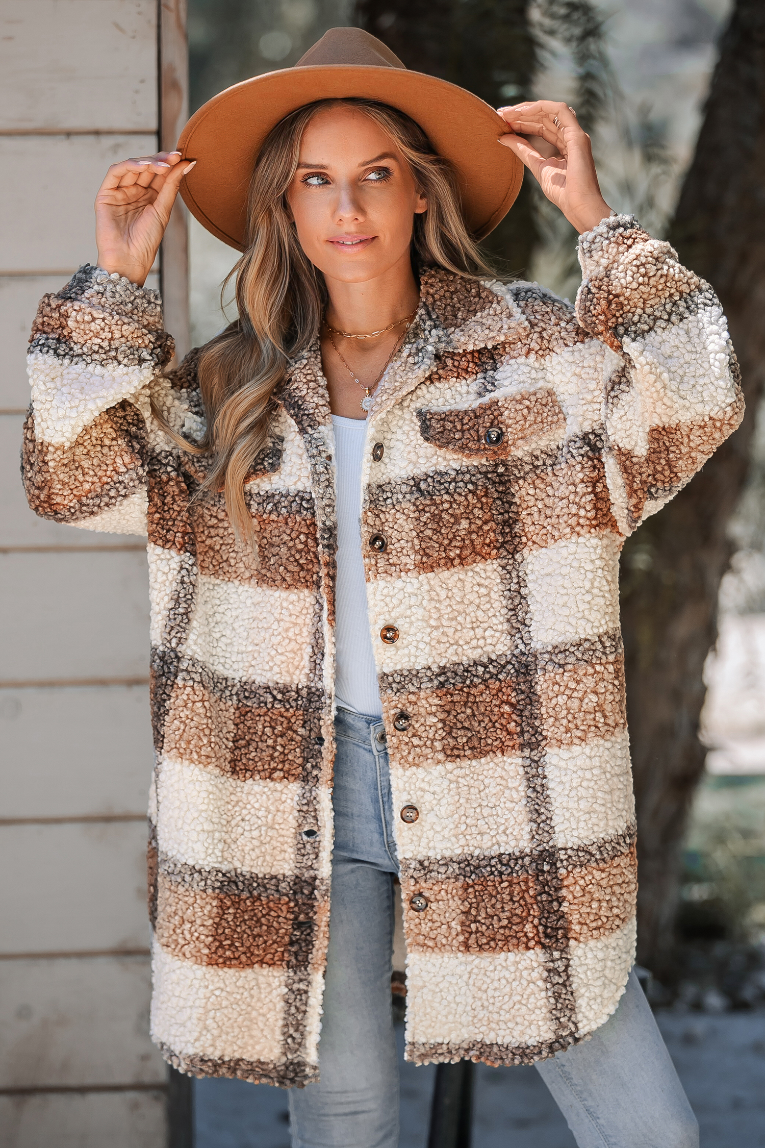 Tan Plaid Sherpa Button-Up Trench Coat