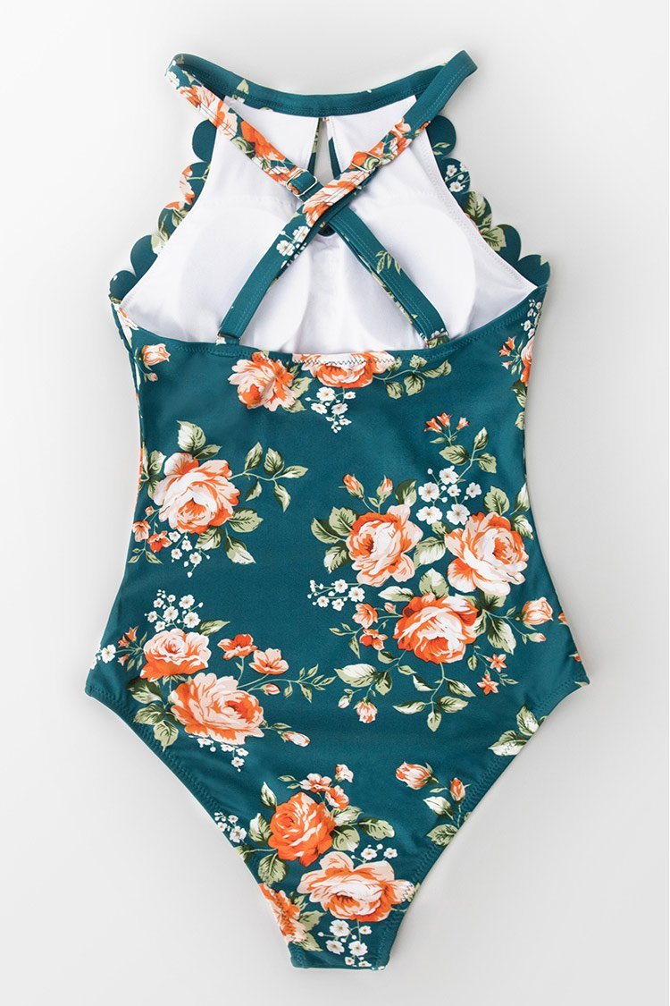 HomeTeal Floral Scalloped One Piece Swimsuit