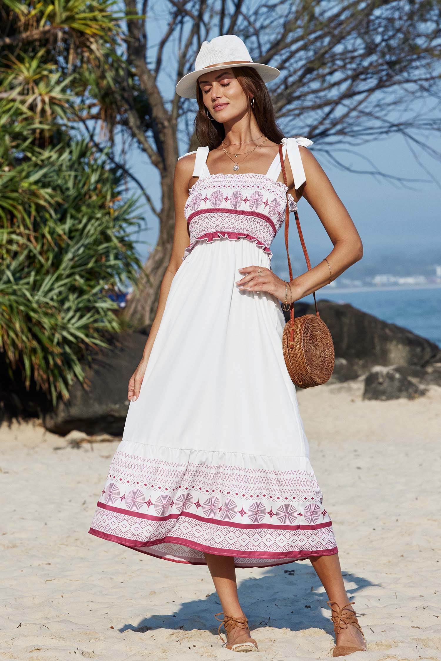 HomeTie-Shoulder Smocked Bodice Boho Maxi Dress