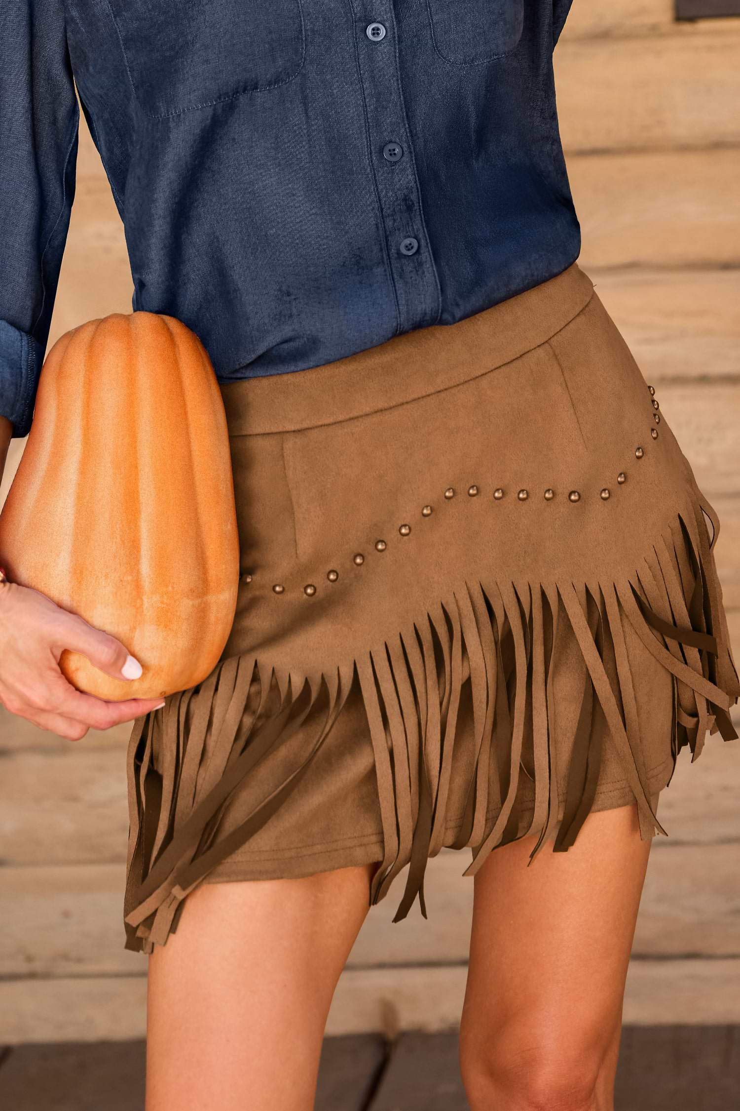 The Western Whim Brown Mini Skirt is all about movement, attitude, and a little wild spirit! The faux suede fabric, fringe hem, and mini length give you that modern cowgirl energy, perfect for city streets or weekend adventures.