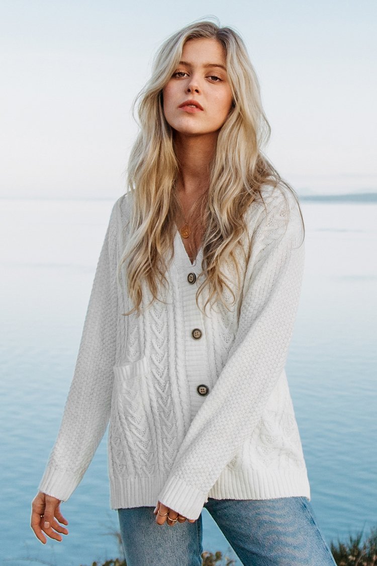 White Buttoned Down Cable Knit Cardigan