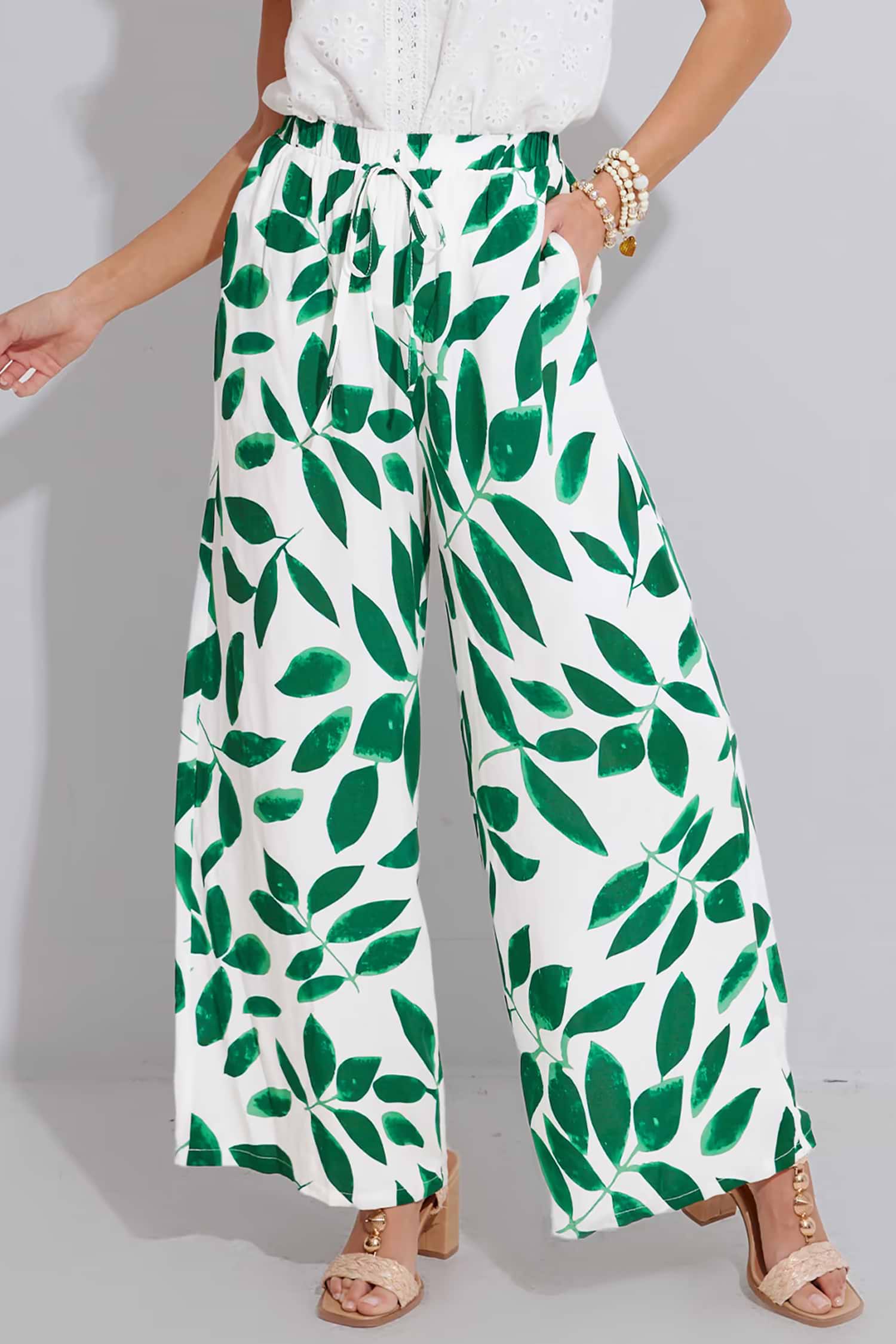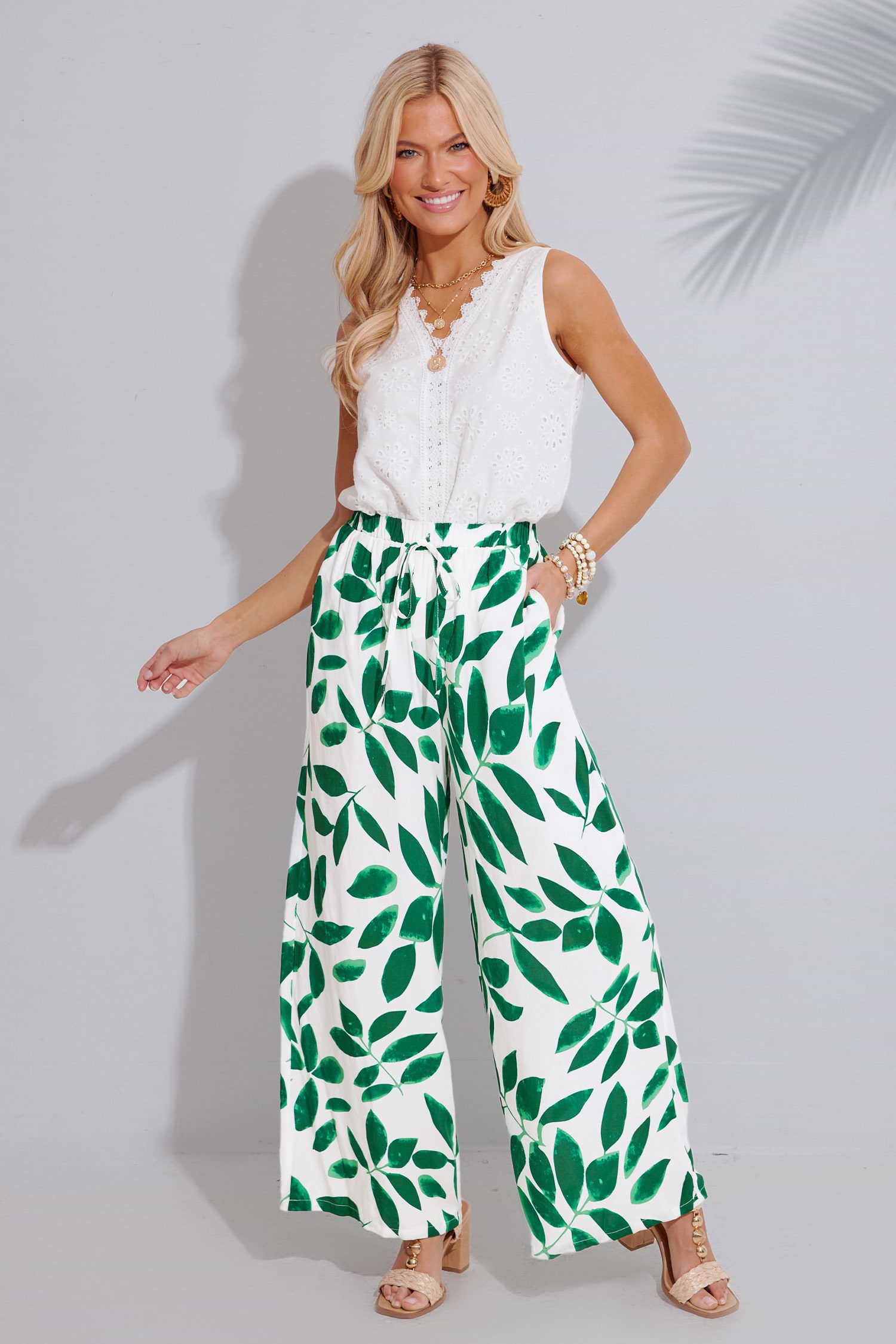 White & Green Tropical Leaf Drawstring Cover-up Pants