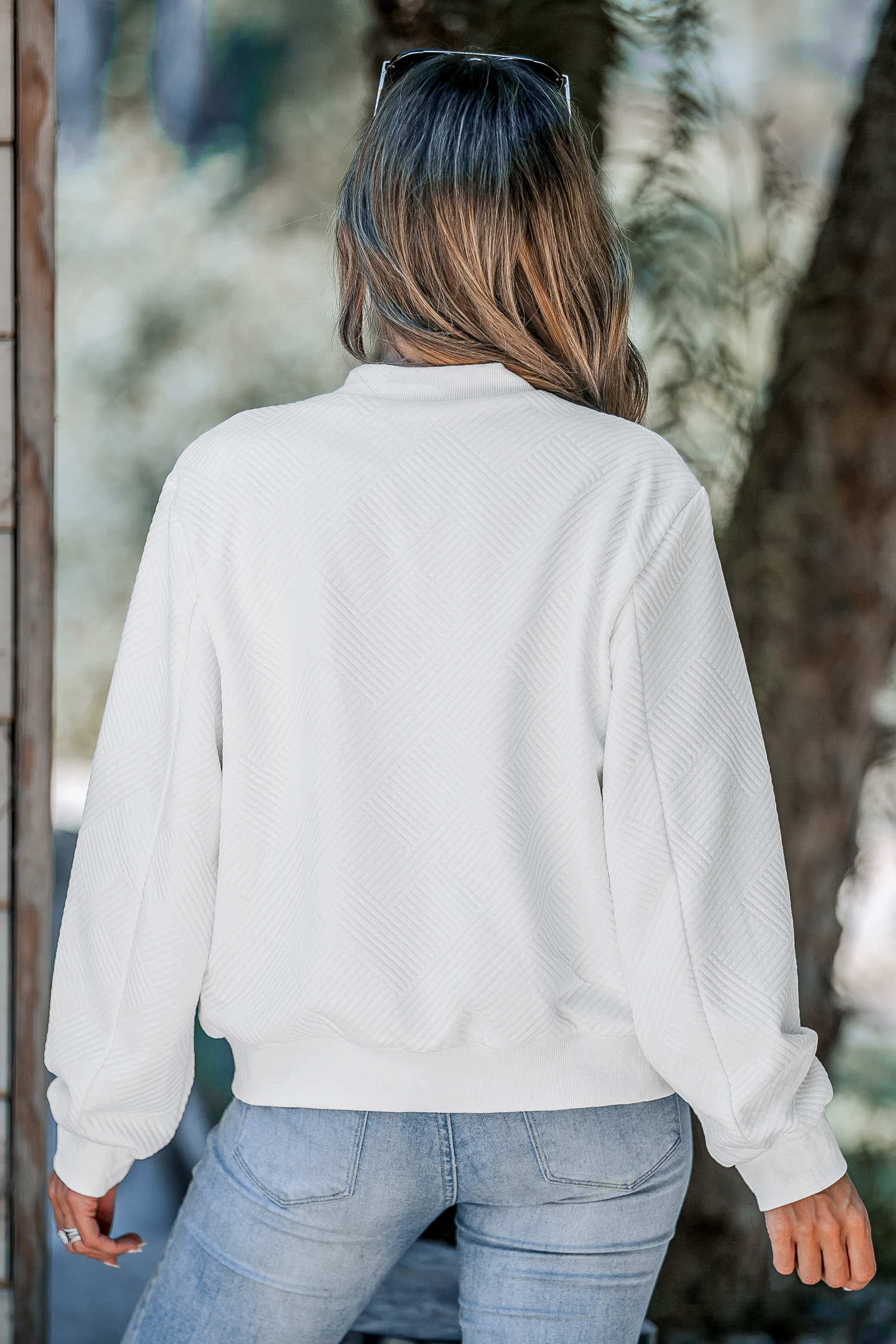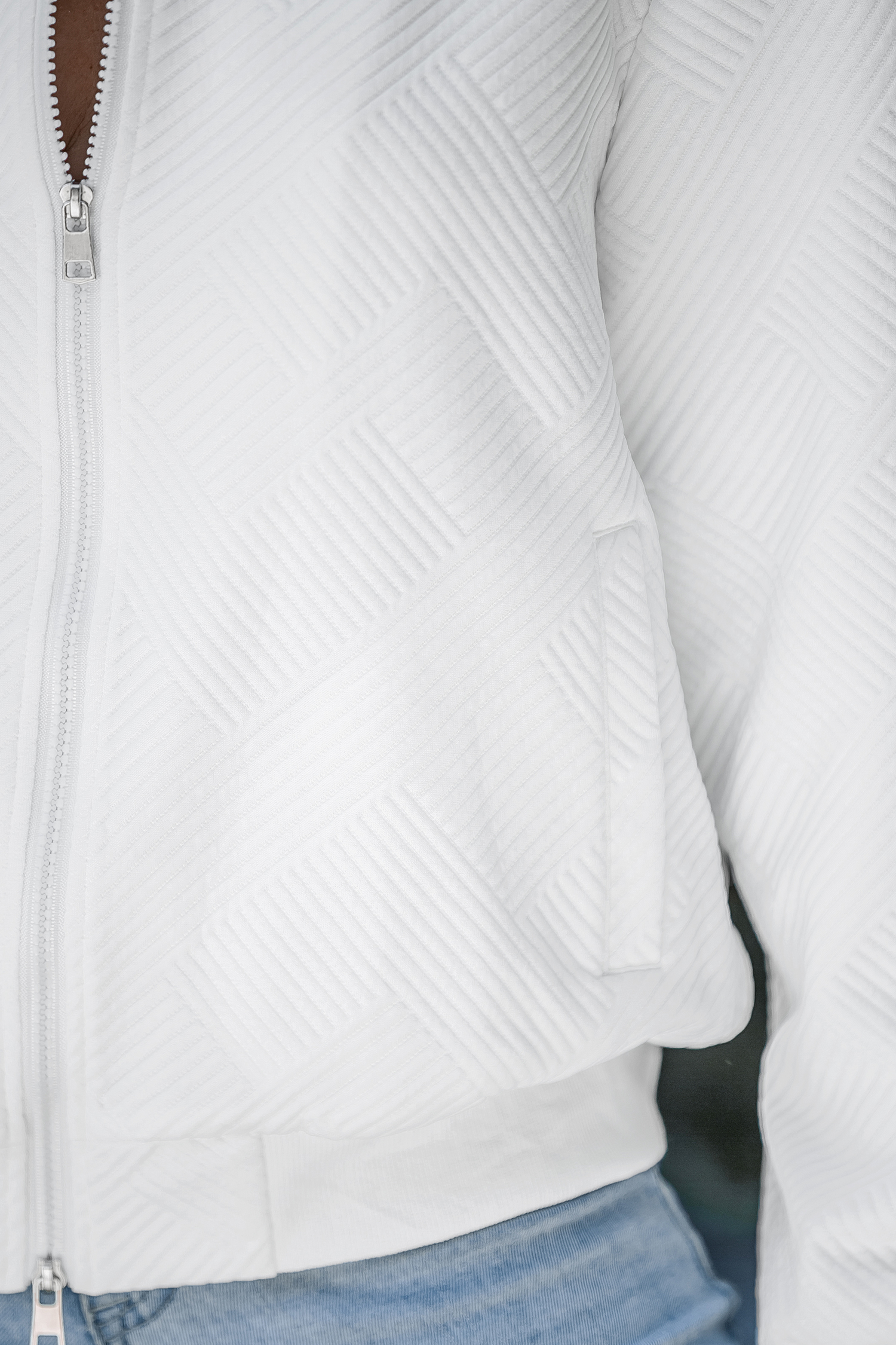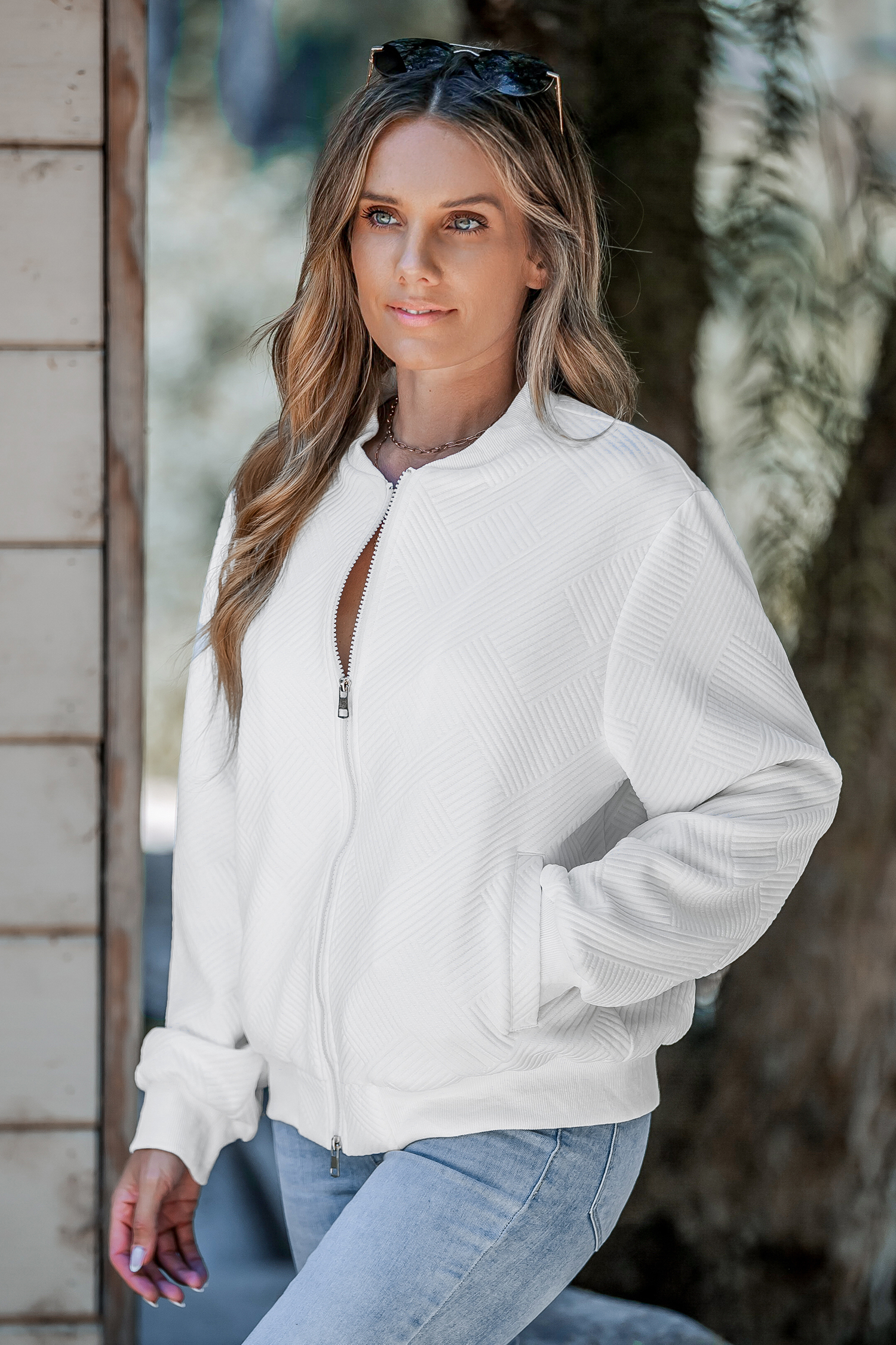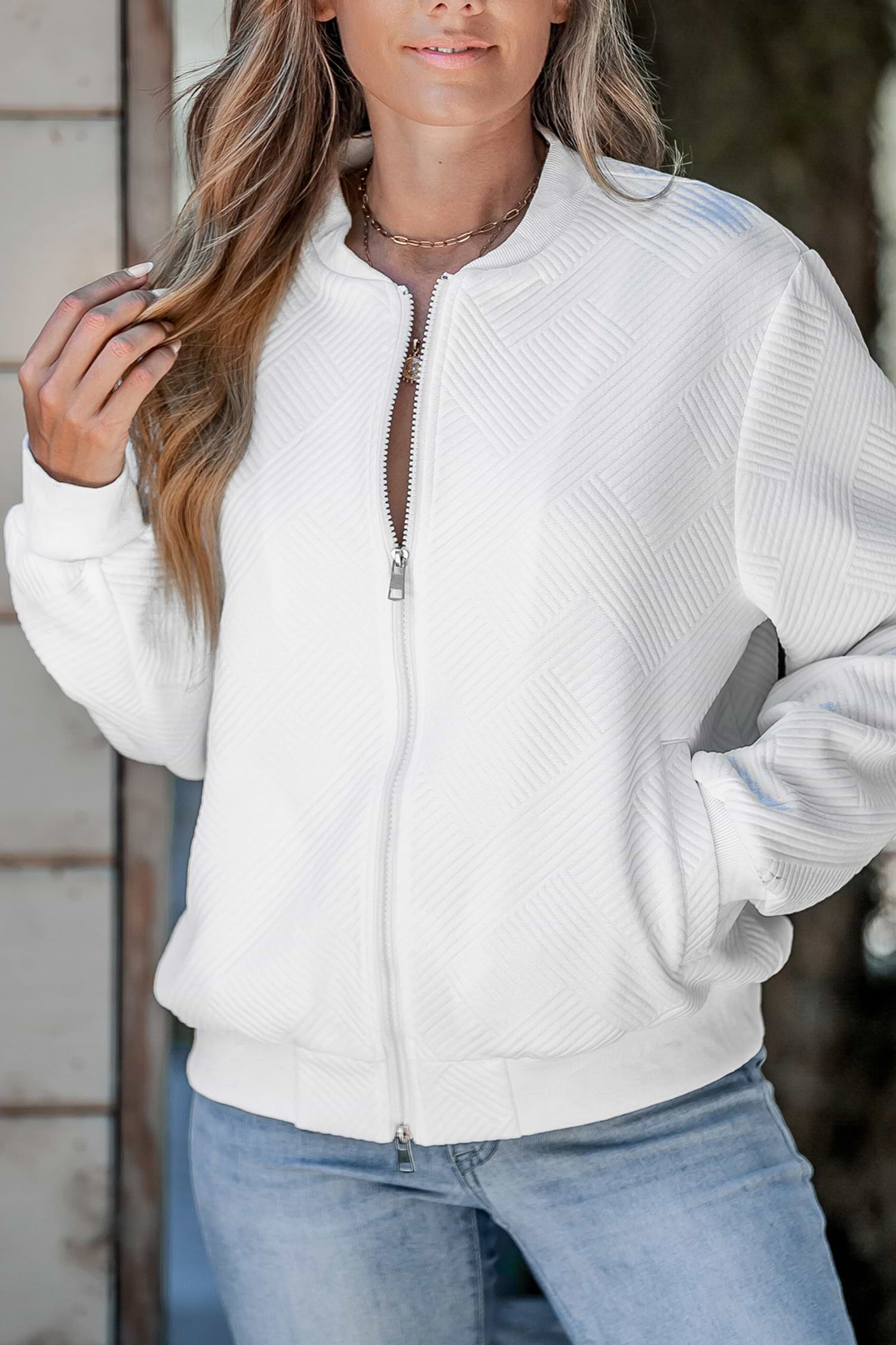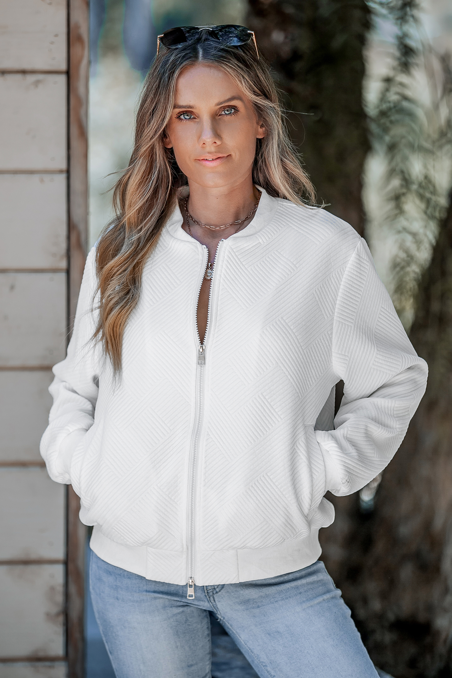 HomeWhite Ribbed Knit Standing Collar Bomber Jacket
