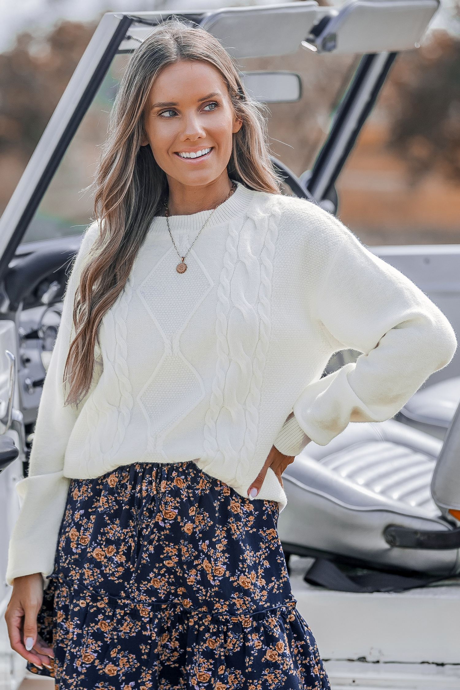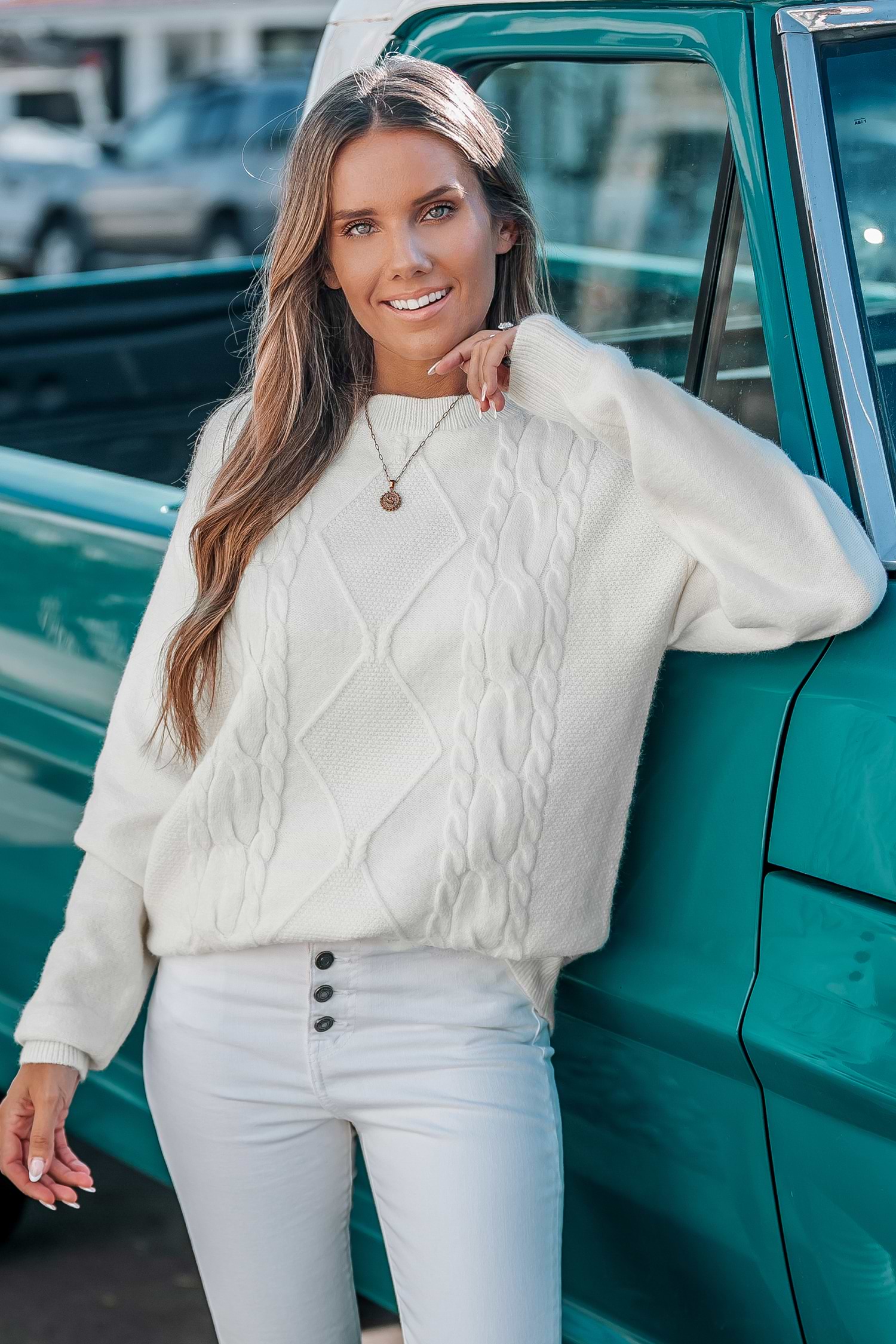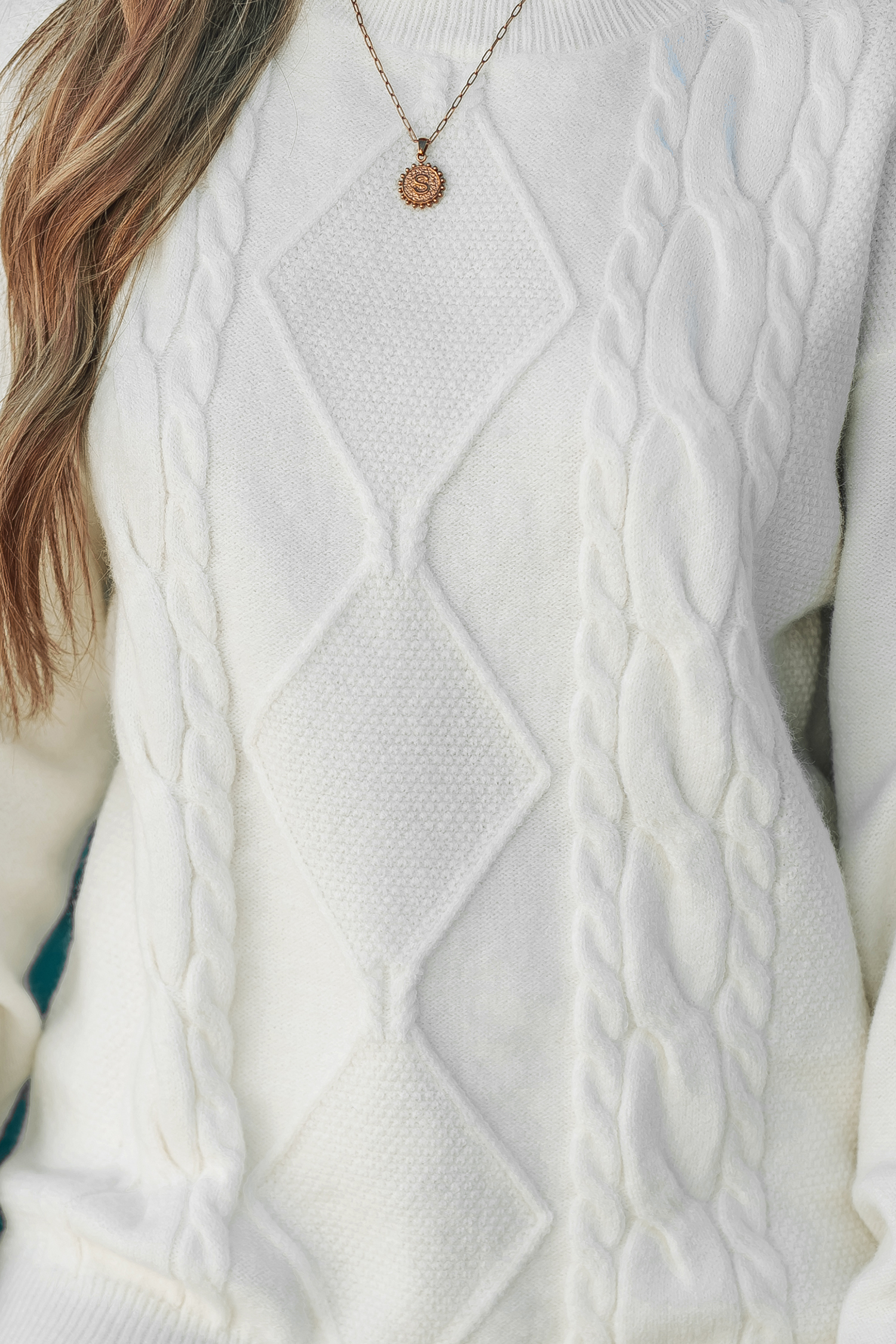 White Round Neck Long Sleeve Cable Knit Sweater Top