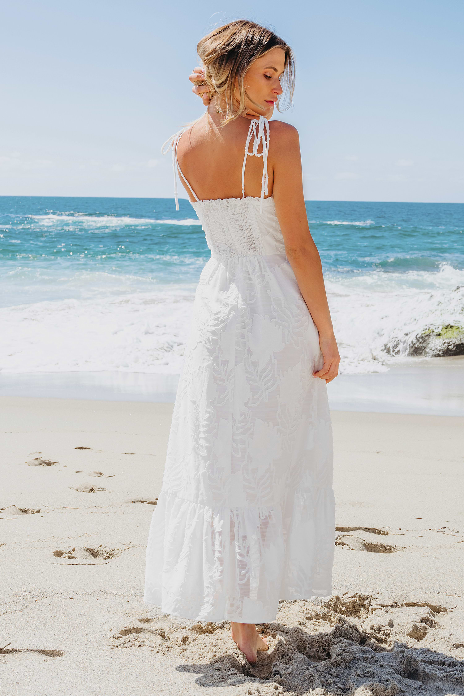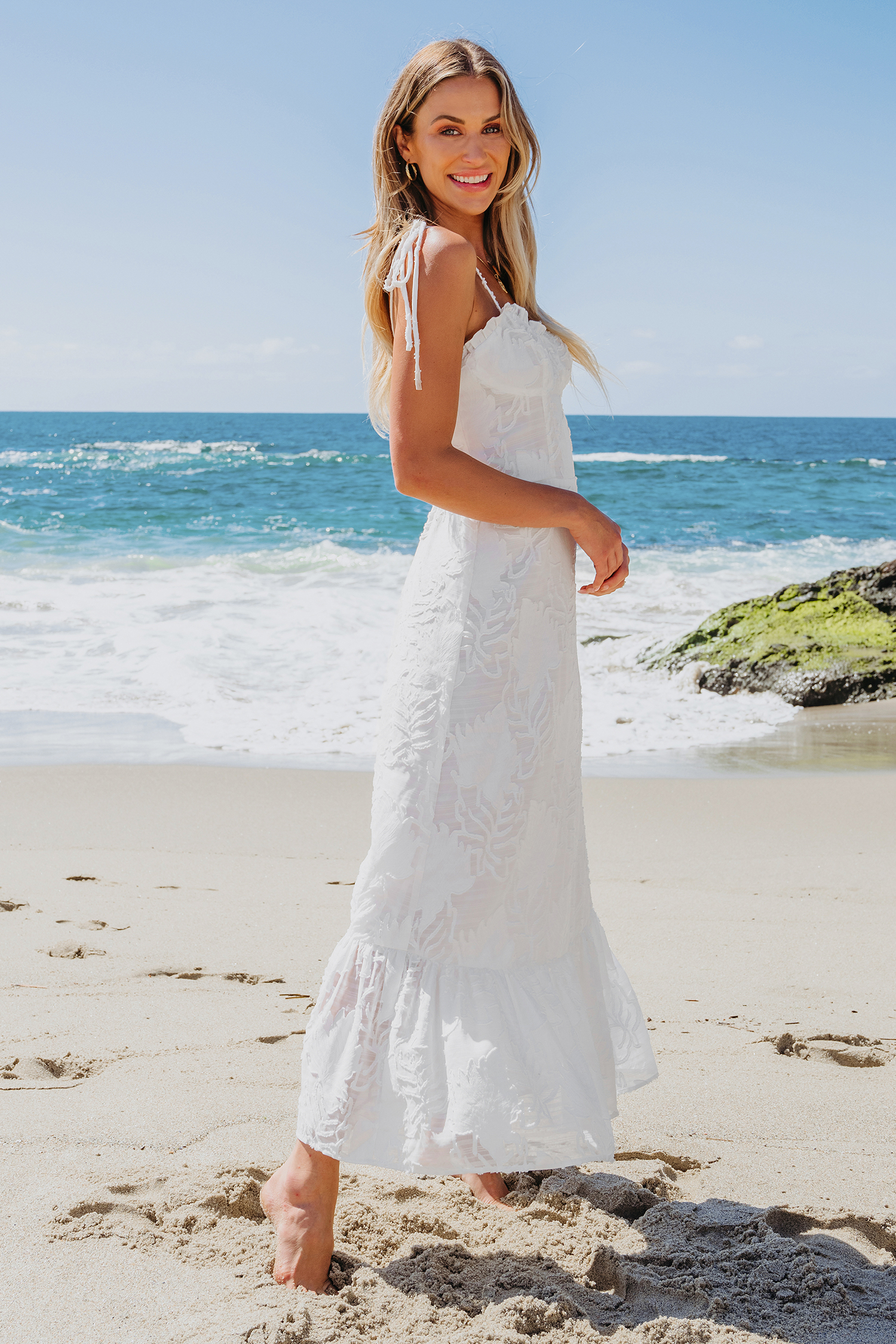 White Sweetheart Tie Shoulder Flounce Hem Maxi Dress