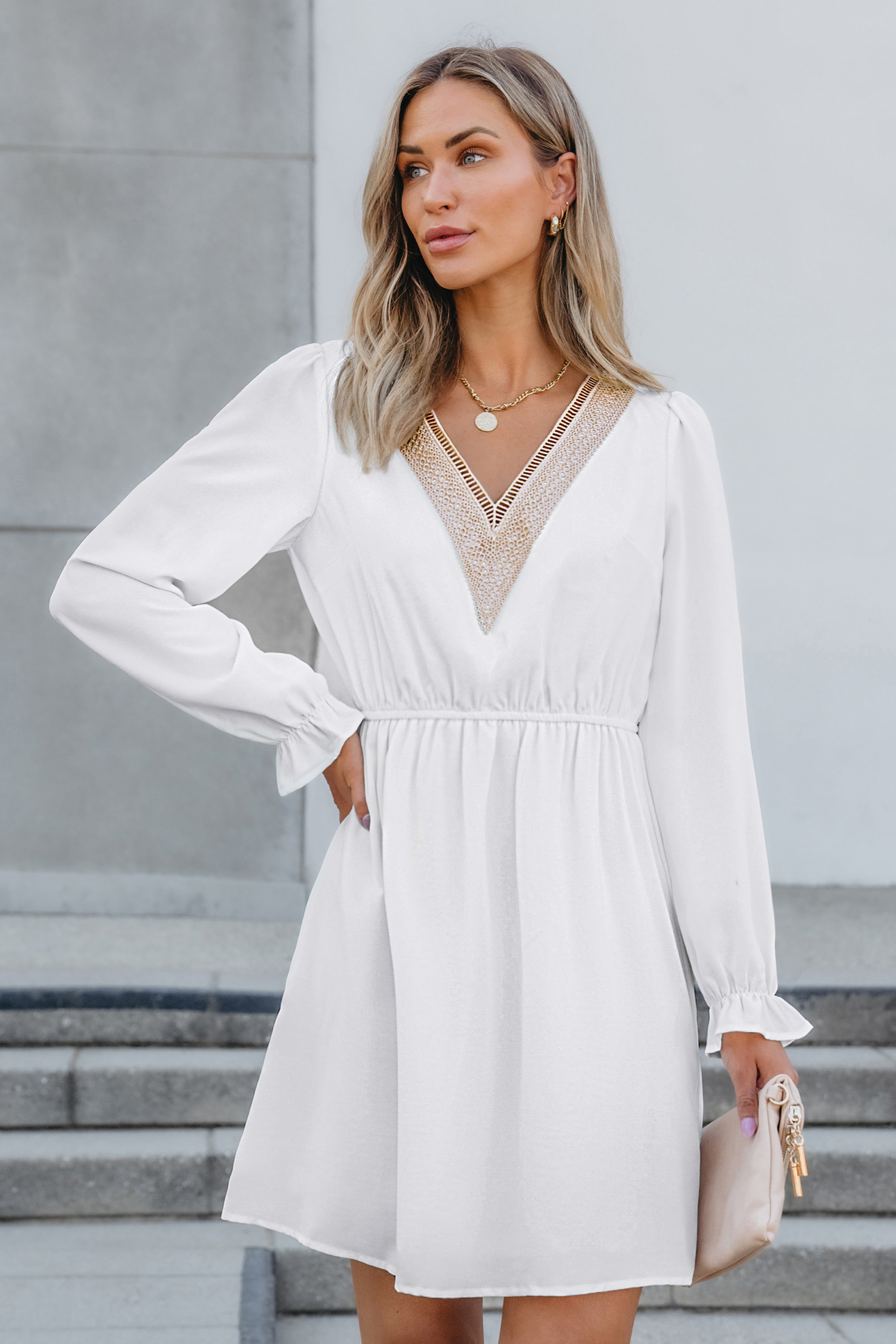 HomeWhite V-Neck Poet Sleeve Cinched Waist Mini Dress