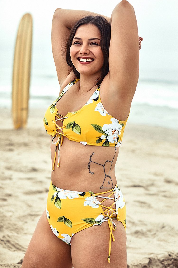 HomeYellow Floral Print Lace Up Plus Size Bikini