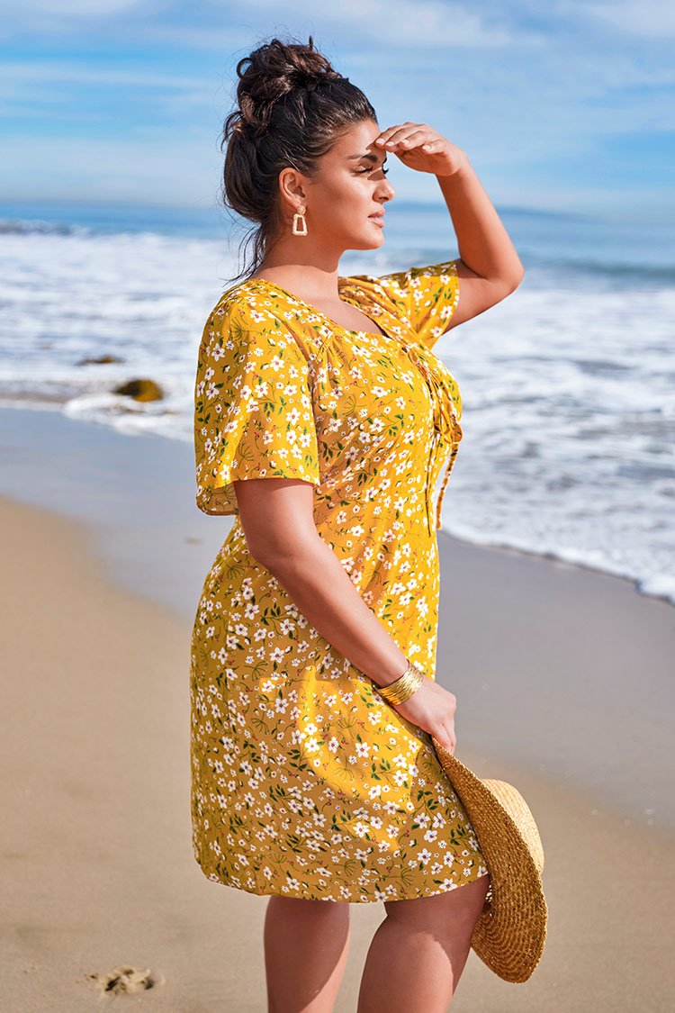 HomeYellow Floral Smocked Plus Size Dress